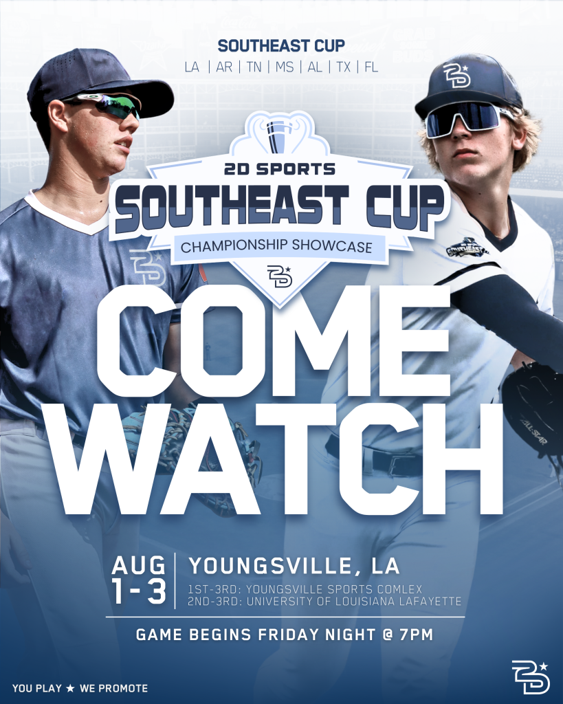 The Southeast Cup and Junior Southeast Cup are headed to Lafayette & Youngsville, Louisiana this Friday, August 1 through August 3rd. Some of the most talented baseball players from across the Southeast region will take the field in a high-stakes, high-energy showcase with 30+ colleges in attendance.